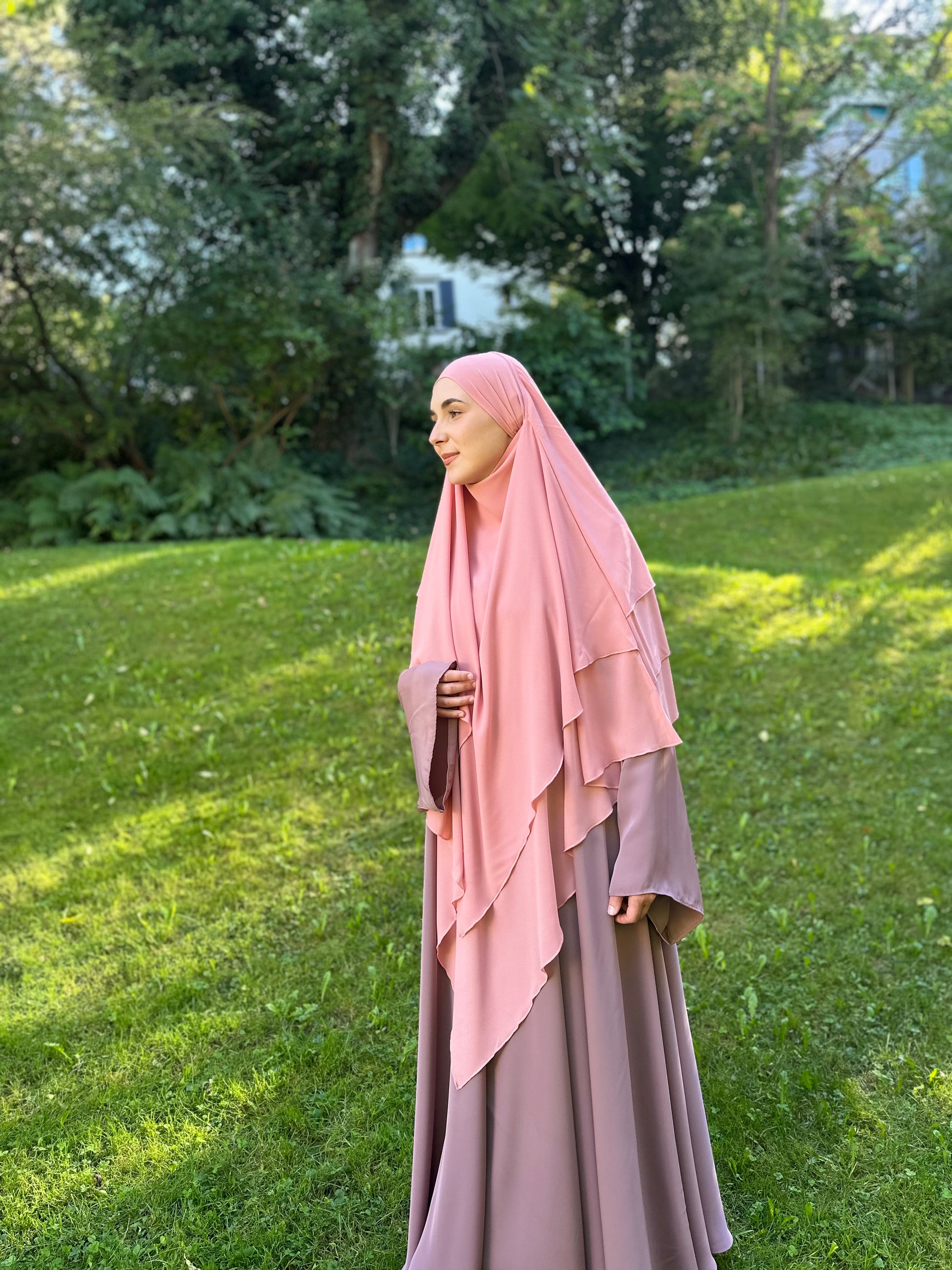 Der Khimar zeichnet sich durch seine drei eleganten Chiffonrüschen aus und bietet einen raffinierten und fließenden Stil. Mit einer Länge von 110 cm vorne und 150 cm hinten garantiert es eine dezente und anspruchsvolle Abdeckung. Dieser in Frankreich aus hochwertigem Polyester hergestellte Khimar ist perfekt, um Ihre Outfits mit einem Hauch von Anmut zu vervollständigen.