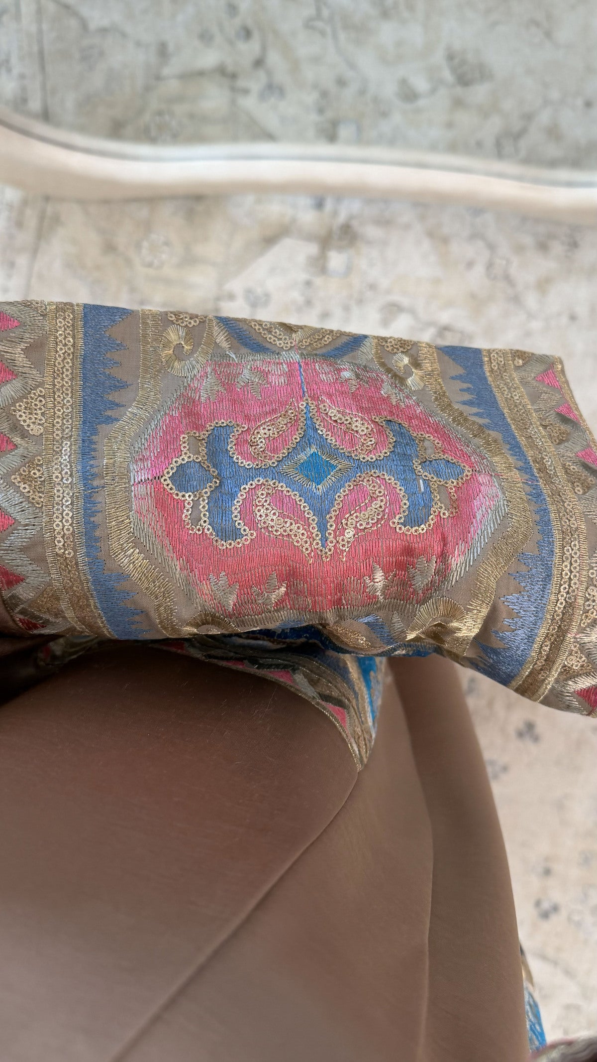 Langes 2-teiliges Abaya-Set mit weitem und geradem Schnitt, das einen strukturierten und bedeckenden Fall bietet, aus glattem Stoff mit leicht saturiertem Finish gefertigt, verziert mit großen dekorativen orientalisch inspirierten Einsätzen an den Ärmeln und am unteren Brustbereich, die Charakter und eine raffinierte Verarbeitung verleihen, ideal für Kunden, die ein elegantes und gepflegtes Erscheinungsbild möchten.